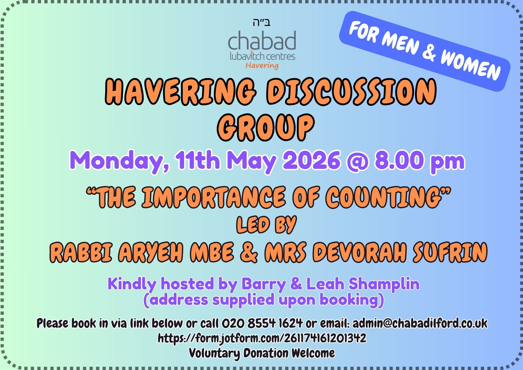 Rabbi Sufrin MBE, Exec Director Chabad N E London & Essex says; “continuous requests have been made to us over a fair period of time, asking Chabad to get more involved in the area of Havering. In discussion with my wife Devorah, we decided that we must respond. In addition to three thriving Chabad Houses, based in Ilford, Buckhurst Hill & Epping with full time Chabad Emissaries, regular activities are held in Southend and now Havering.”